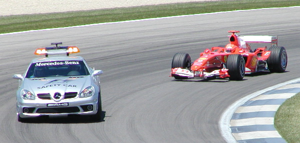 | The race barely got restarted when Ralph Schumacher had a similar tire problem that spun him backwards into the outside wall in turn 13 (Not that I knew it at the time as there are no tv's in view of these stands. If you sit here ,you better have a radio if you want to know what is happening in the race.) He was hurt and did not get out of the car. I mentioned in these journals a year or so ago about the ineptness of the ambulance crew at the F1 race. This time was no different - the ambulance took 3 MINUTES to get to him!! They took him out on a stretcher, then paraded him around the entire track. Later they said he was just bruised. Once he got back to Germany they discovered he'd broken his back in two spots and would have to sit out of racing for a few months! |
