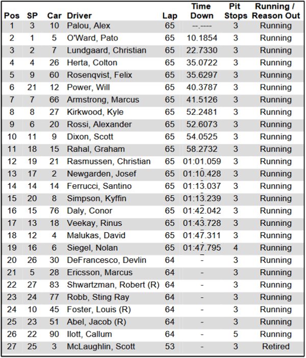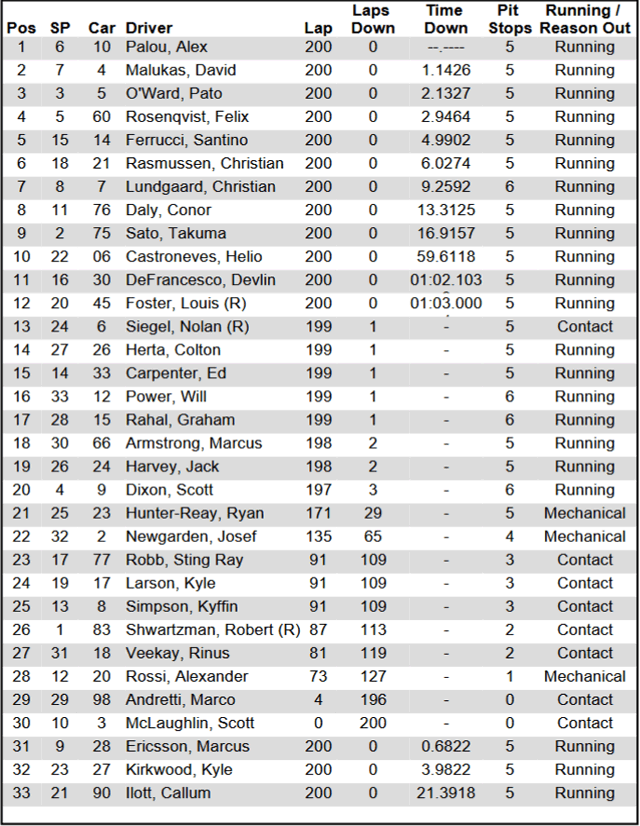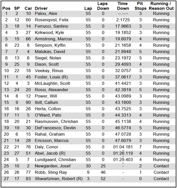 | 46 156.342 mph 198.368 - Palou 20 among 12 drivers |