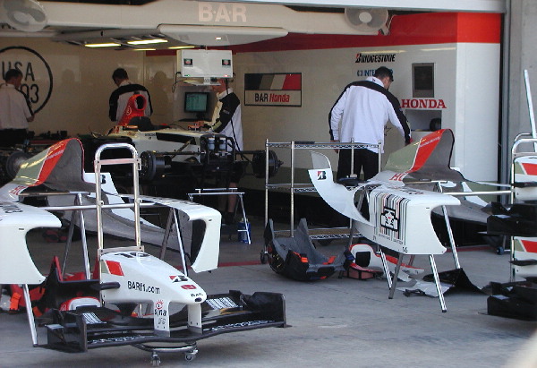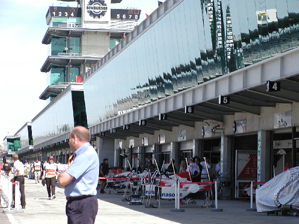 | IMS somehow managed to talk the Formula One guys into letting down their high barriers somewhat. While they still had everything blocked off behind their garages so that no fans could see in or come near, they were going to let ticketholders walk along the pit lane next to the front of their garages as they setup for tomorrow's action. While this may not sound very exciting to Americans, I believe this is unprecedented in the Formula One world. |