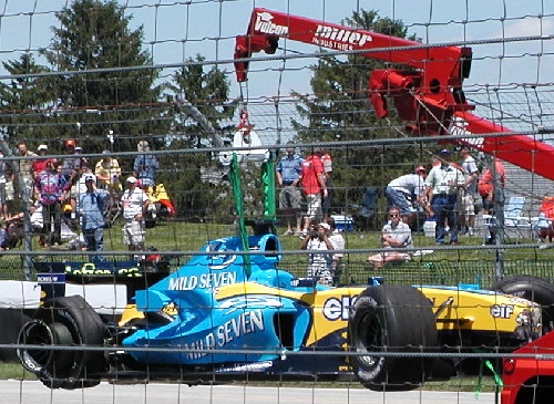 | The race barely got restarted when Ralph Schumacher had a similar tire problem that spun him backwards into the outside wall in turn 13 (Not that I knew it at the time as there are no tv's in view of these stands. If you sit here ,you better have a radio if you want to know what is happening in the race.) He was hurt and did not get out of the car. I mentioned in these journals a year or so ago about the ineptness of the ambulance crew at the F1 race. This time was no different - the ambulance took 3 MINUTES to get to him!! They took him out on a stretcher, then paraded him around the entire track. Later they said he was just bruised. Once he got back to Germany they discovered he'd broken his back in two spots and would have to sit out of racing for a few months! |