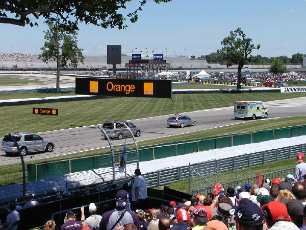 | After getting sunburned yesterday, the sun was too much for ET today, so he went down front to stand under the shade of a tree. This freed up some room for me. We would see quite a bit of the safety car during this confusing race. |