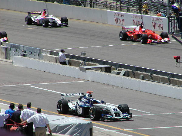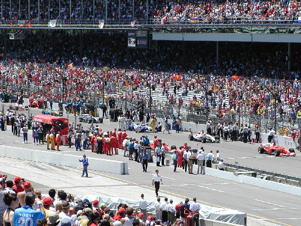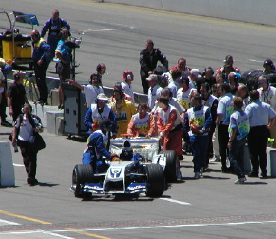 | The cars started their engines and began the warmup lap, that is except Montoya. His car wouldn't start and he jumped out and ran for his garage. Here you can see them pushing his car off of the track. |