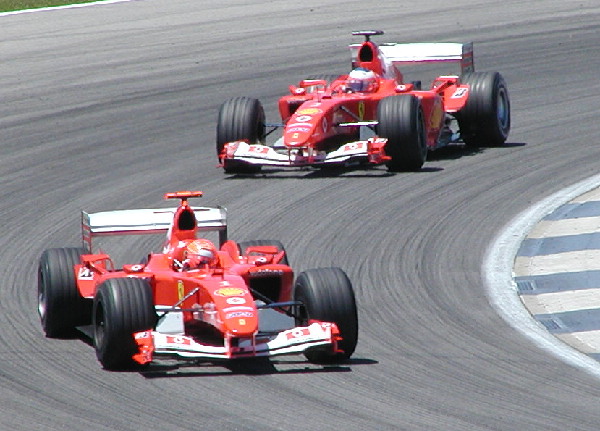 | For a while, the two BAR Hondas were on Schumi's tail, but something happened to them and Rubens began trying to catch Michael. |