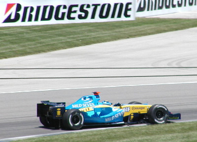 | My favorite driver, Fernando Alonso, had a stunning start, weaving back and forth on the opening run, moving from 9th place (8th now with Montoya out) to 3rd by the first turn!! I was soon bumming though. His right rear tire had evidently picked up some shard and blew out as he approached turn 1. His car had a high-speed wiggle and then went nose-first into the outside wall. :-( |