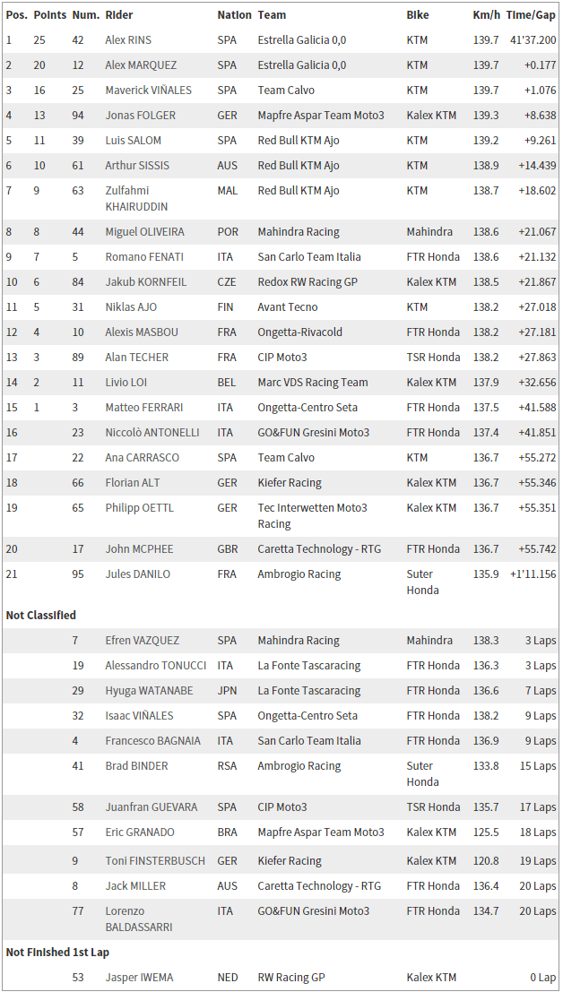 | Moto 3 Podium Alex Marquez (2nd), Alex Rins (1st), Maverick Vinales (3rd) |