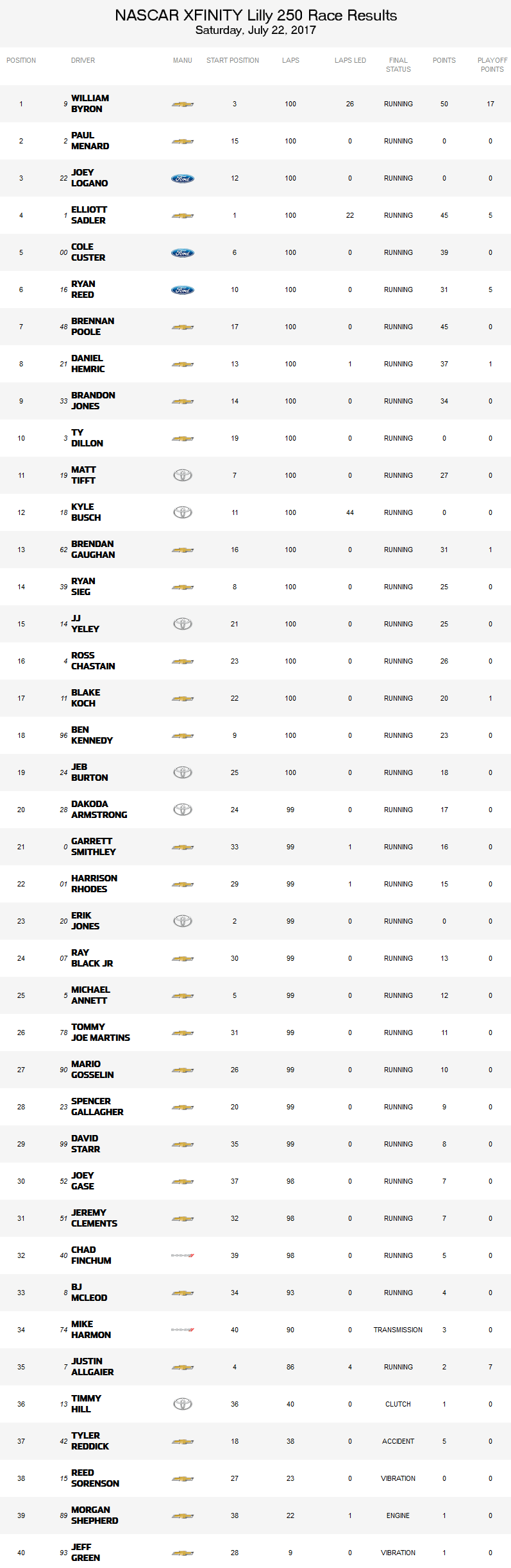 | NASCAR XFINITY Series Lilly Diabetes 250 at Indianapolis Motor Speedway July 22, 2017 Results |