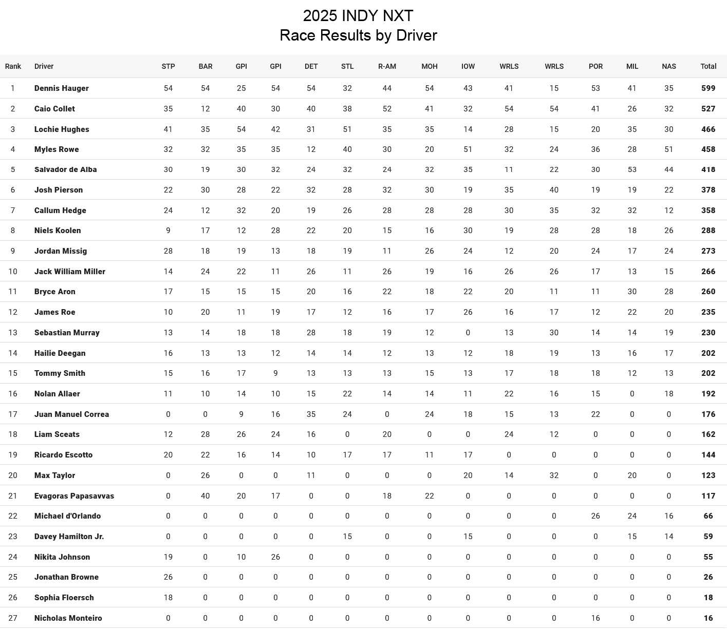 Note: Indy NXT races awards $15,000 for the winner, $5,000 for second place and $2,500 for third place