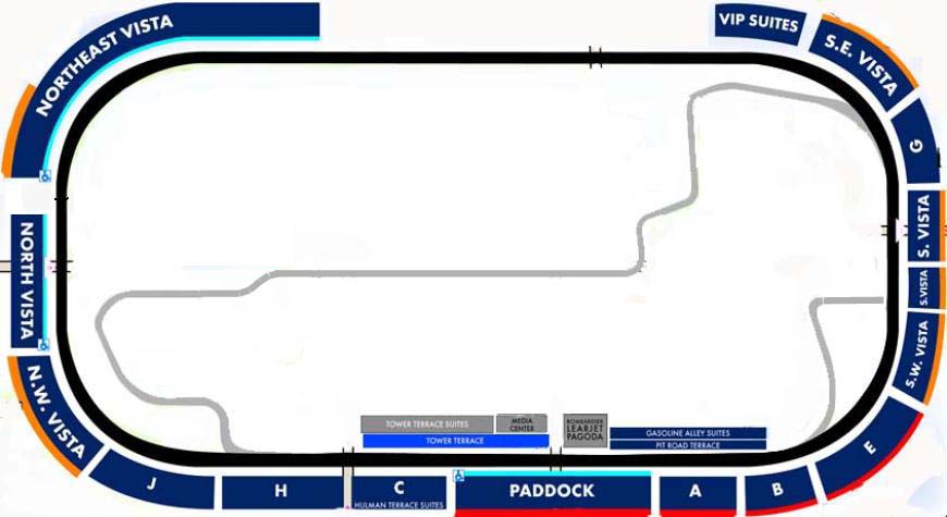 You'll find aerial view of the track with section and row numbers, as well as photos showing the view from the stands.