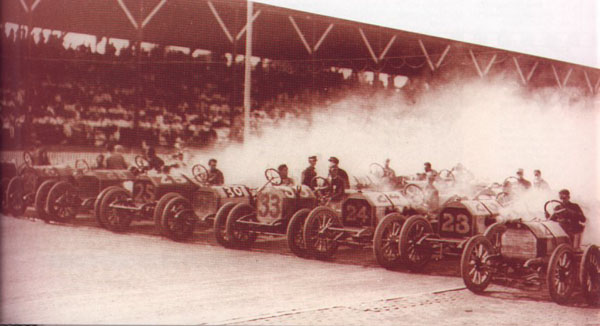 The start of a 1910 race at the Indianapolis Motor Speedway
