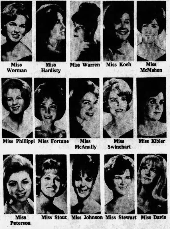 The Court Meredith Ann Mueller (20 y/o, 5' 3.5", 102 lbs) Susan Karen Peterson (19 y/o, 5' 4", 117 lbs) Gloria Gae Seeburger (18 y/o, 5' 6", 115 lbs) Joyce Eloise Worman (20 y/o, 5' 6", 96 lbs)