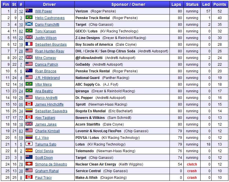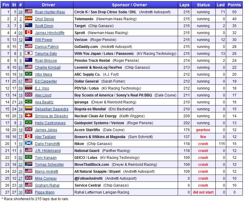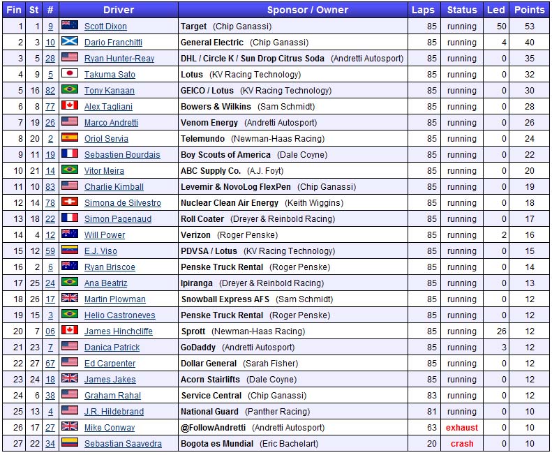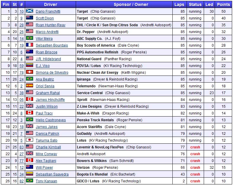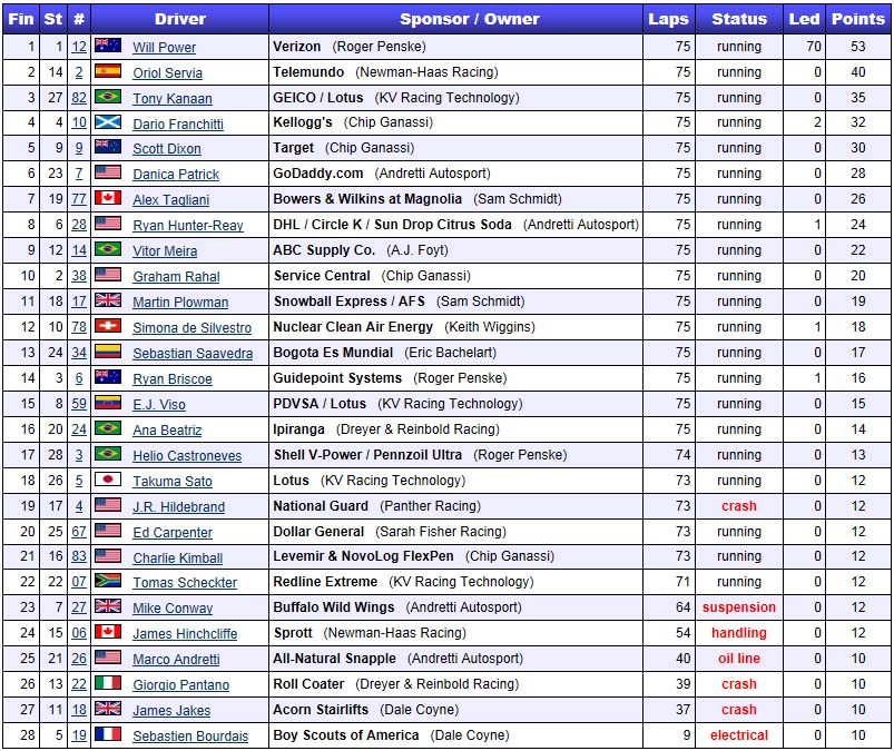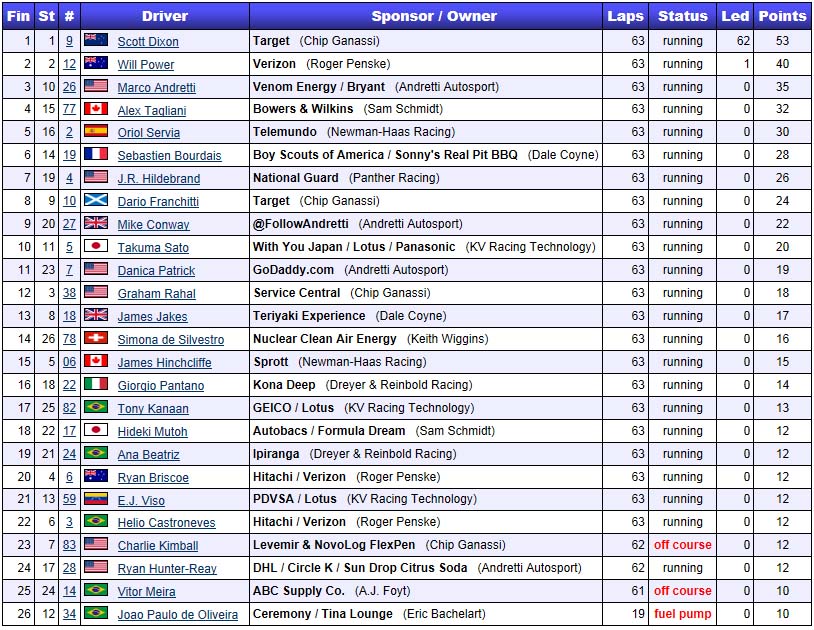 Due to the death of Dan Wheldon during the race, the race was halted, handing the championship to Dario Franchitti.