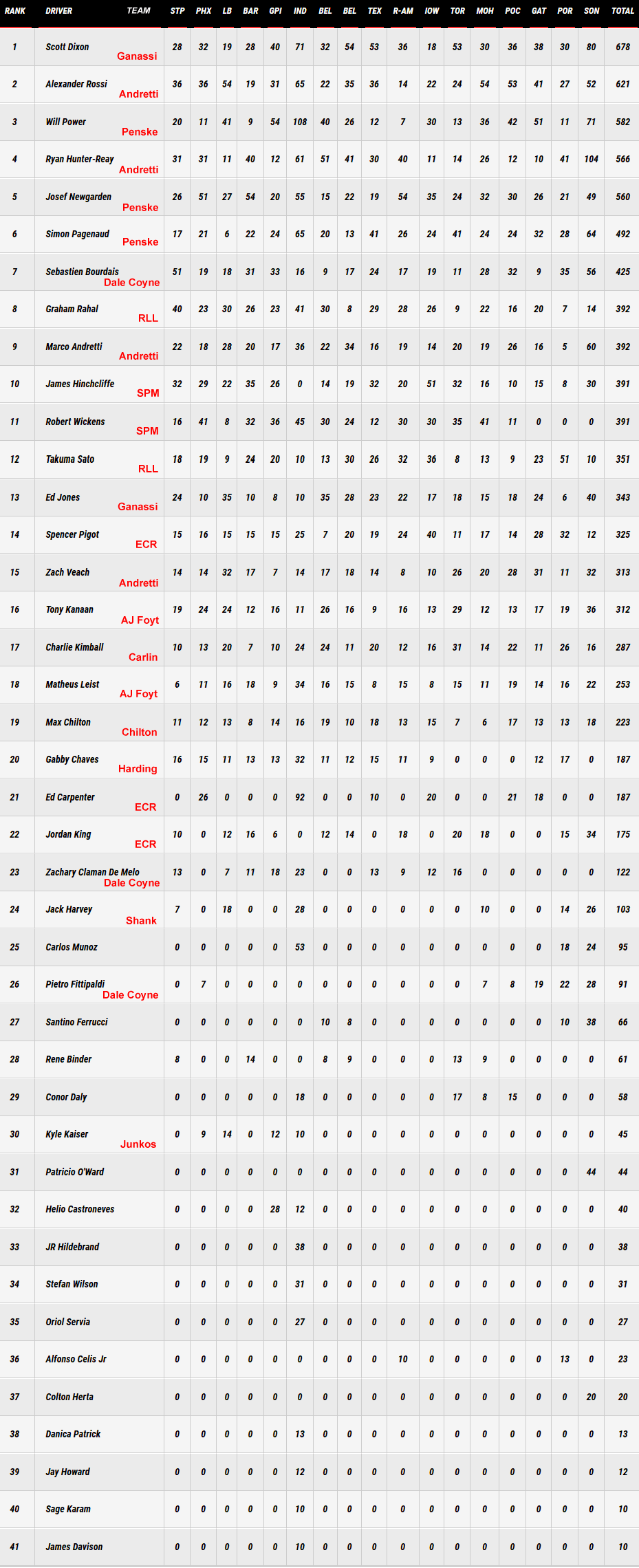 IndyCar Championship Points are awarded to engine manufacturers, drivers and entrants.