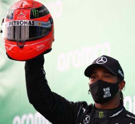 Lewis Hamilton equaled Michael Schumacher's Record Number of Race Wins today. Mick Schumacher presented him with one of his dad's helmets.