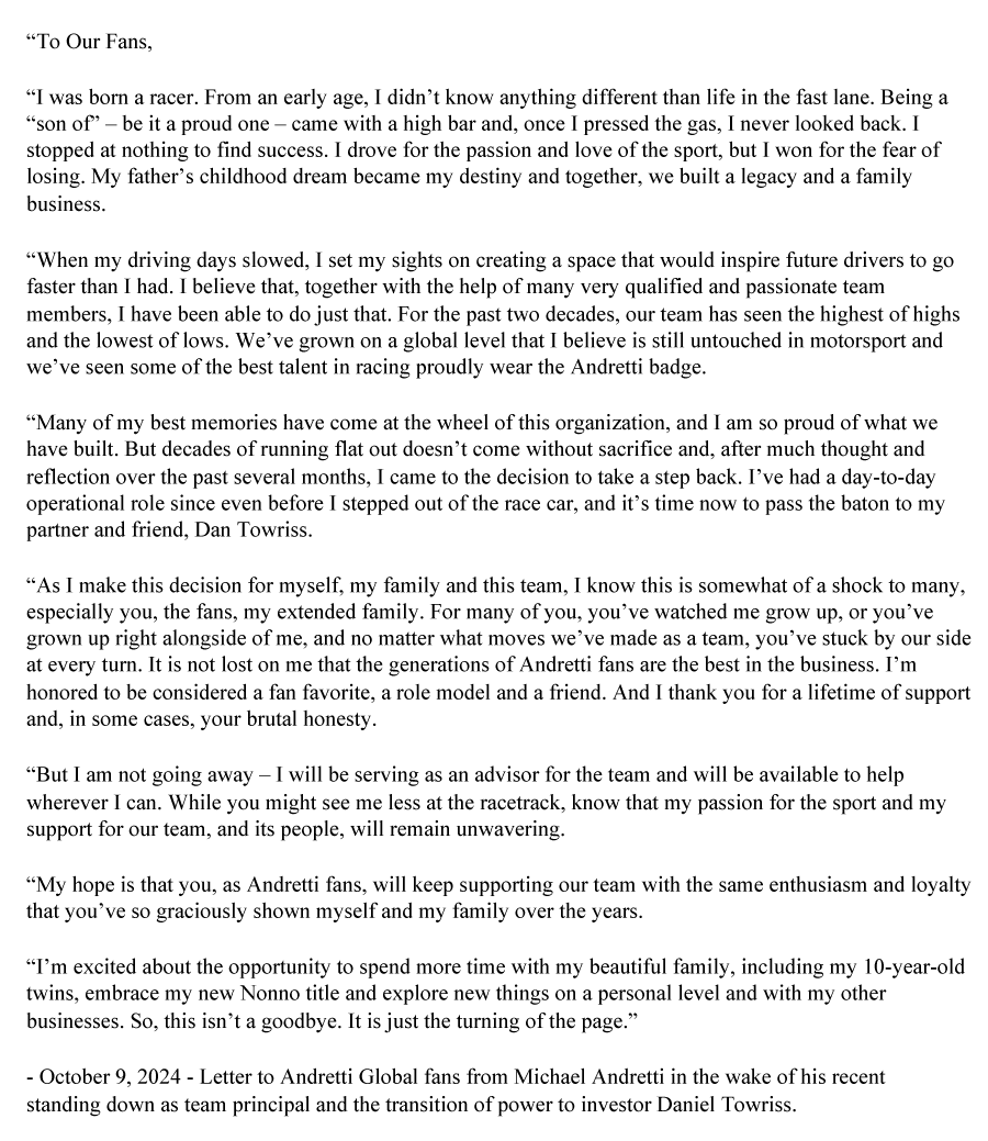 Michael Andretti published a "Letter To Our Fans" and wanted to clear up a few misconceptions.