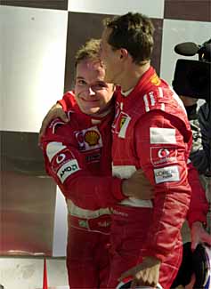 Rubens Barrichello continues impressing with his improved maturity and driving skill. He qualified for the pole position over Ralf; Michael was back on the 2nd row! I hoped Ruben's Ferrari wouldn't let him down for the start of this race. It didn't. He kept the lead at the start while his teammate, M. Schumacher grabbed 2nd. Kimi once again outqualified DC and Ralf outqualified Montoya. Jaques Villeneuve qualified poorly, but on race day his car seemed to be a contender. Although he had an incident in the beginning stages of the race (he ran Fretzen right off the track) he quickly worked his way all the way up to 4th. But after a pitstop shuffle (he had 3 pitstops) he was in 8th. This was a very exciting race. In the beginning of the race, Kimi again had car trouble, his engine blew. When Panis' BAR Honda engine blew, it locked up his rear wheels and gave him a scare. He handled the car beautifully, it stayed on the track and came to a stop in the middle toward a turn. This brought out the Safety Car. On the last lap, JV's engine blew and gave him a hot seat. He shot out of the cockpit fast and he hopped over the guardrail and got away from that smoking car. The end was disappointing as Ferrari issued the order at the end of the race to Ruben's to slow and let Schumacher take the win. It is sad that Barrichello will miss having his name in the record books after having such a good weekend. The crowd really booed the decision. UP ON THE PODIUM, SCHUMACHER PUSHED RUBENS UP TO THE TOP SPOT. This helped relieve the anger somewhat. He then joined him. Then he gave Rubens the trophy. Montoya drove a smart race, he ran the harder compound tires than his teammate, and ended up in 3rd.