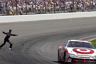 After spending the season griping at his protoge' for crashing, Eddie Cheever ironically crashes into the wall, while his young teammate, Tomas Scheckter, went on to win his first Indy Racing League race, leading most of the day. This was the 8th different IRL winner in the last 8 races!